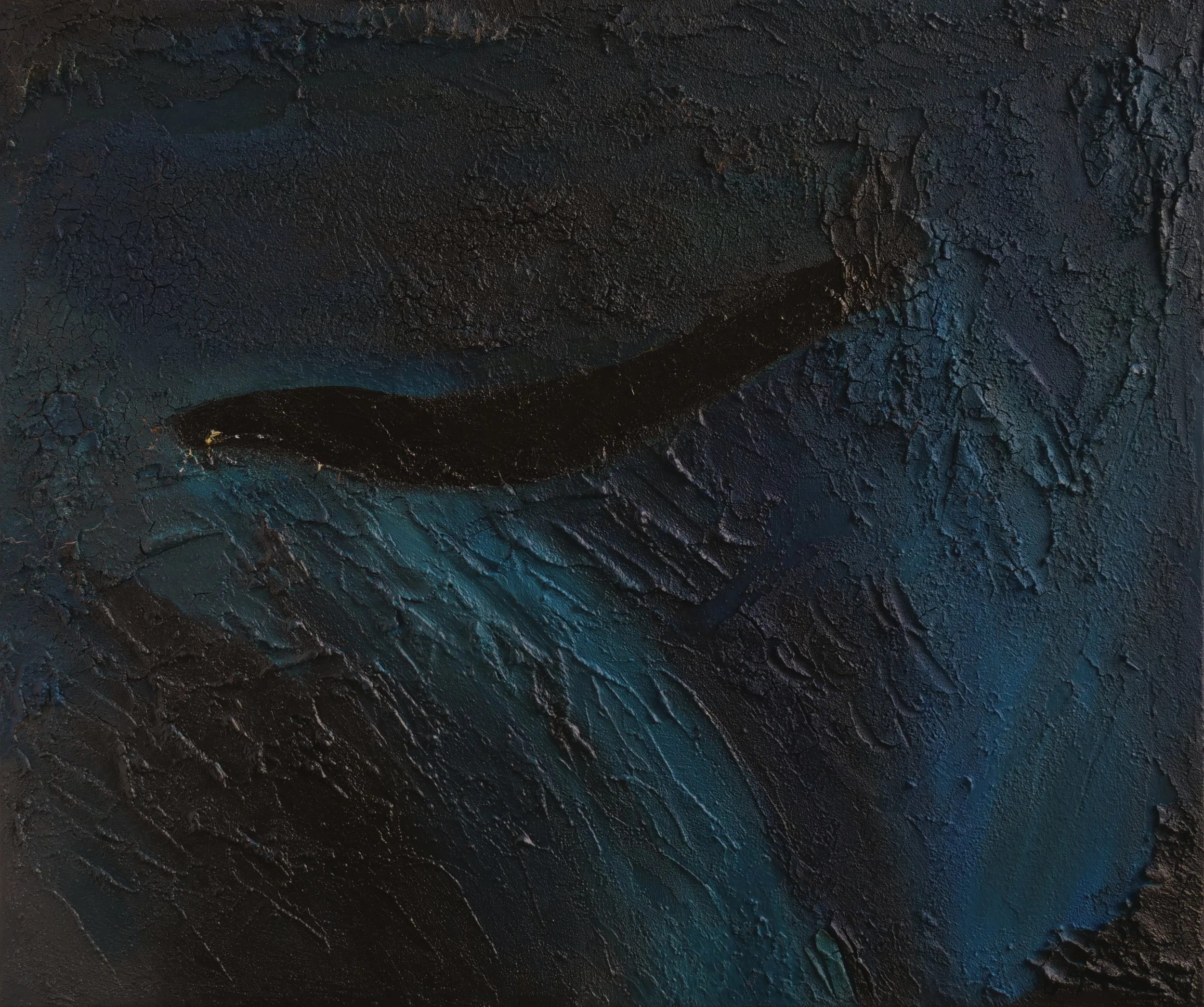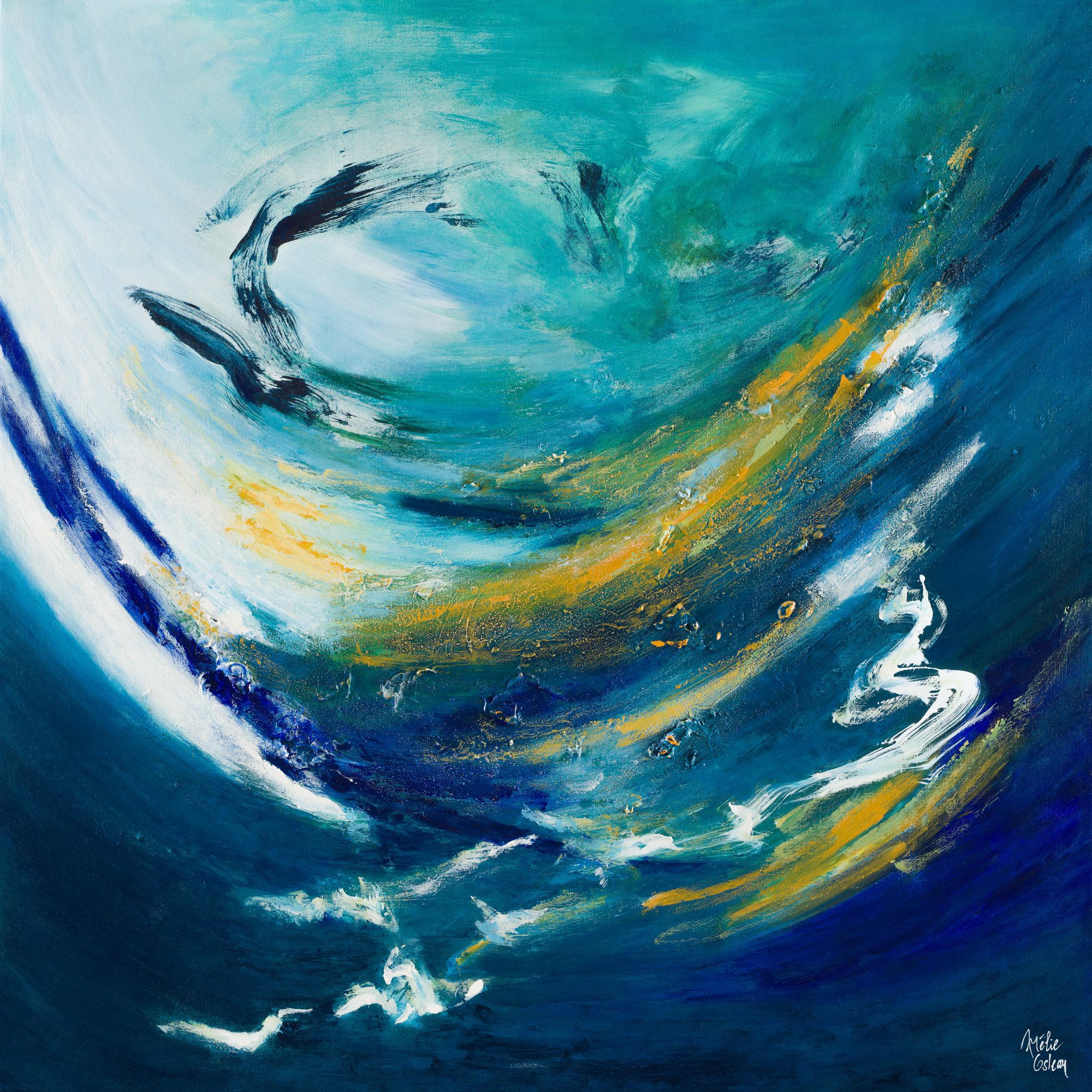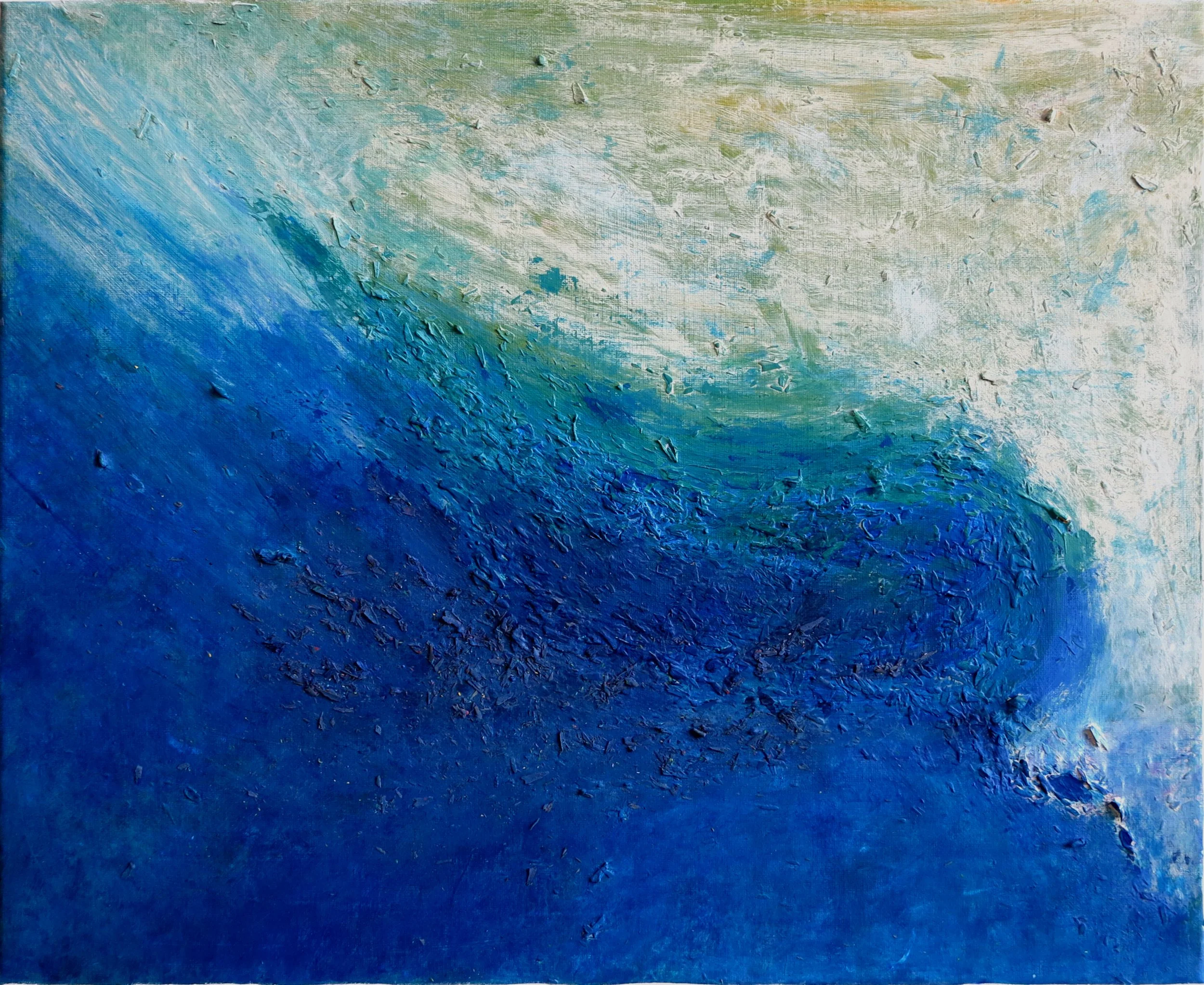 Mes séries Eau, Emergences explorent par le mouvement, par la matière et par les nuances de bleus mariées à des touches plus chaudes,