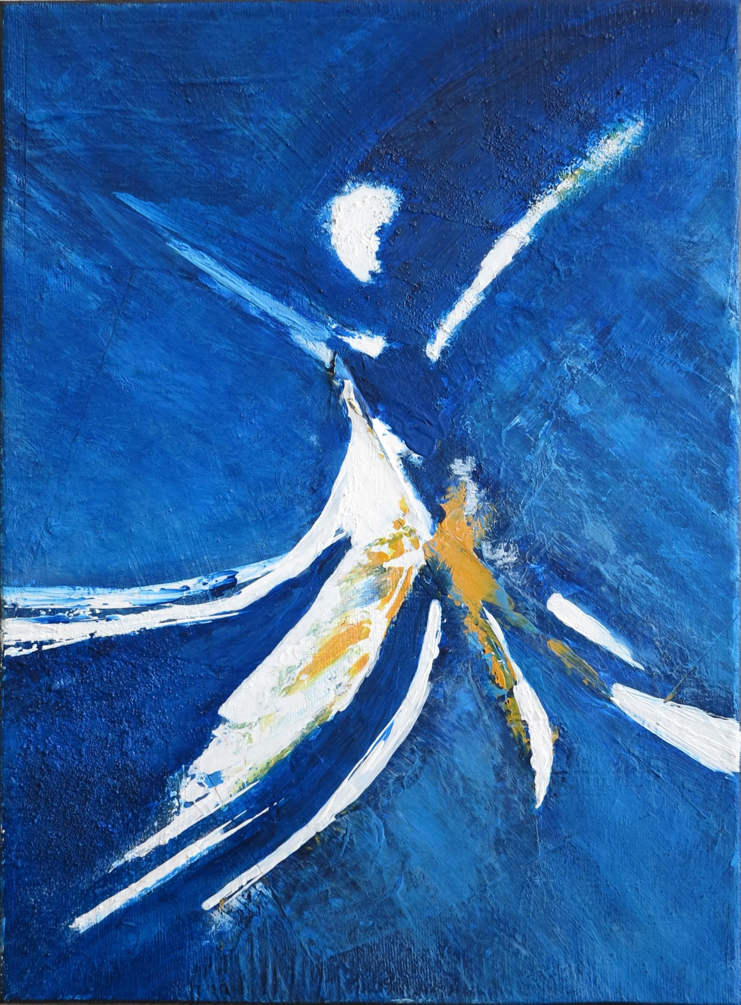 Mes peintures sont pleines de mouvements, de couches et de sous-couches parfois à n’en plus finir… De couleurs souvent vives, et de bleus sans exception ! Elles sont autant l’histoire de ce que je vis, des émotions que je traverse, que l’histoire qui se construira avec vous.